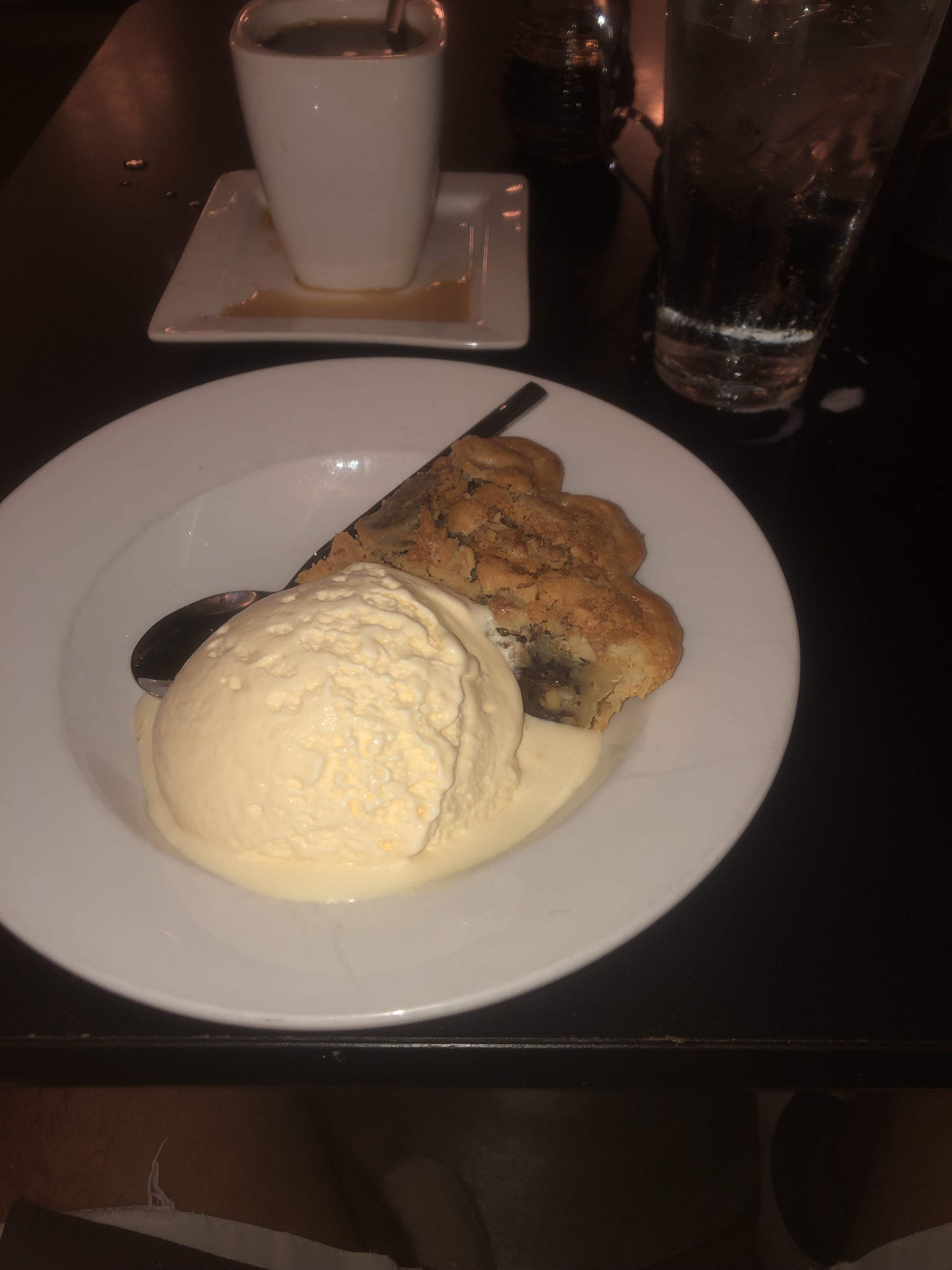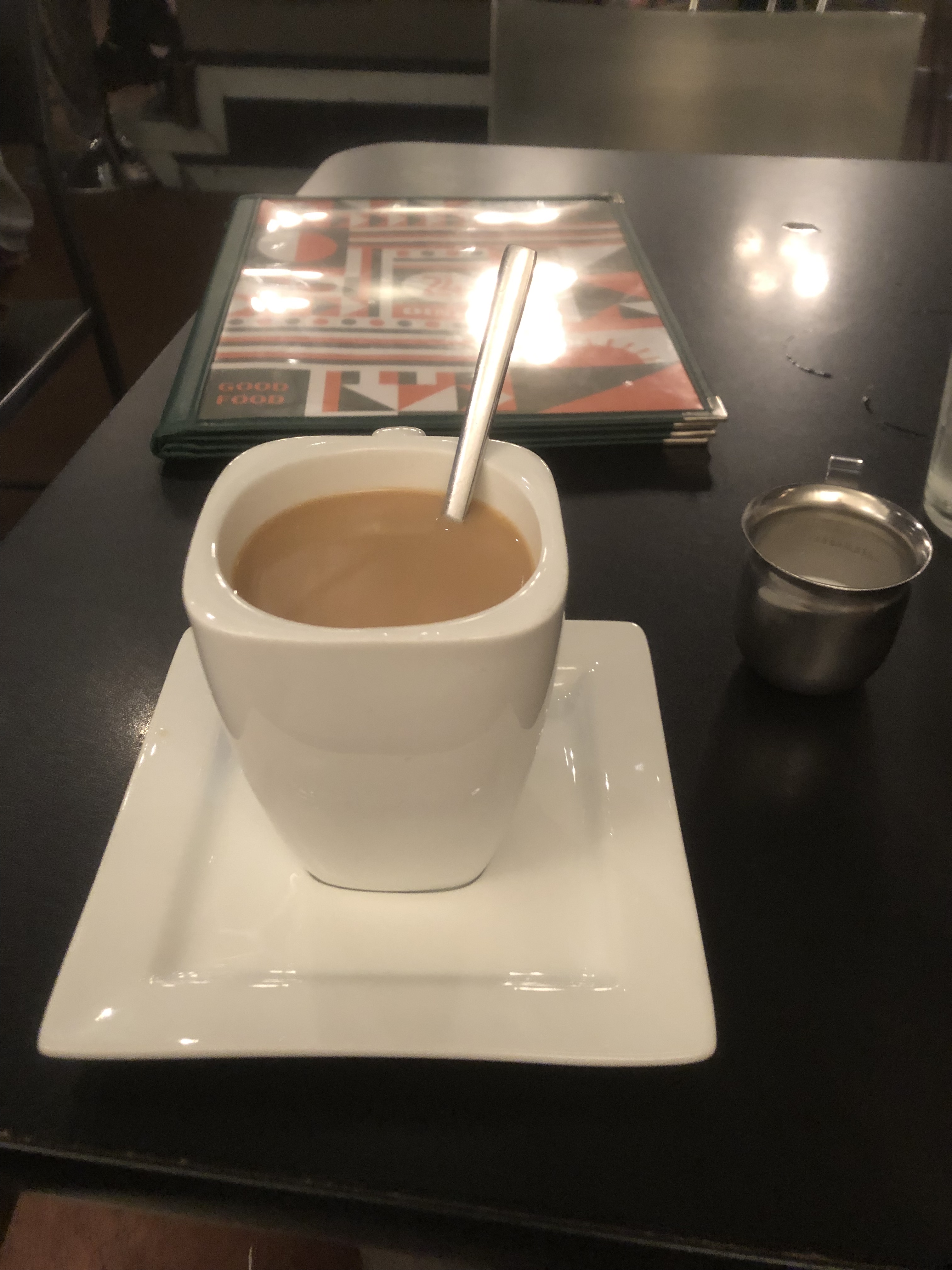 When I walked in, I was in awe of how many people were here on a Wednesday night . After catching myself lost in thought, a couple of the hosts asked to sit me down. They gave me an option to sit at the bar or at a table booth combo. I chose to sit at the cool table booth combo they have going on. As I sat down the booth was not the most comfortable but I’m not picky. The waitress was very kind and the first thing she did was sit a water at my table and asked me if I wanted anything. I ended up choosing from their wide coffee selection from drip coffee to cappuccino, I ended up choosing the drip coffee. I needed a refill quickly after she walked off. Even though the Drip coffee was the cheapest option, it was a good option. It was very smooth and I got a cool little silver cream pouring tray.