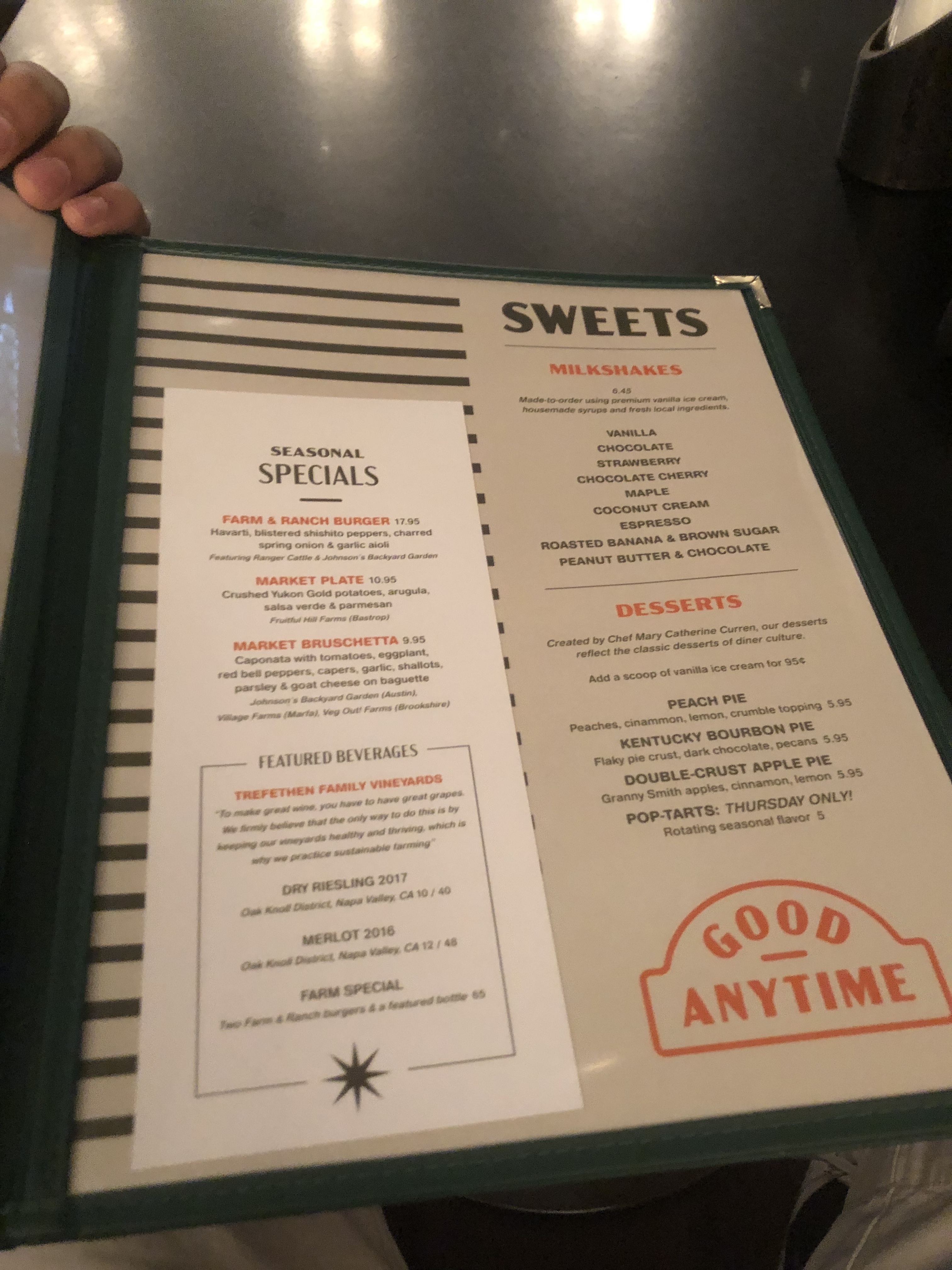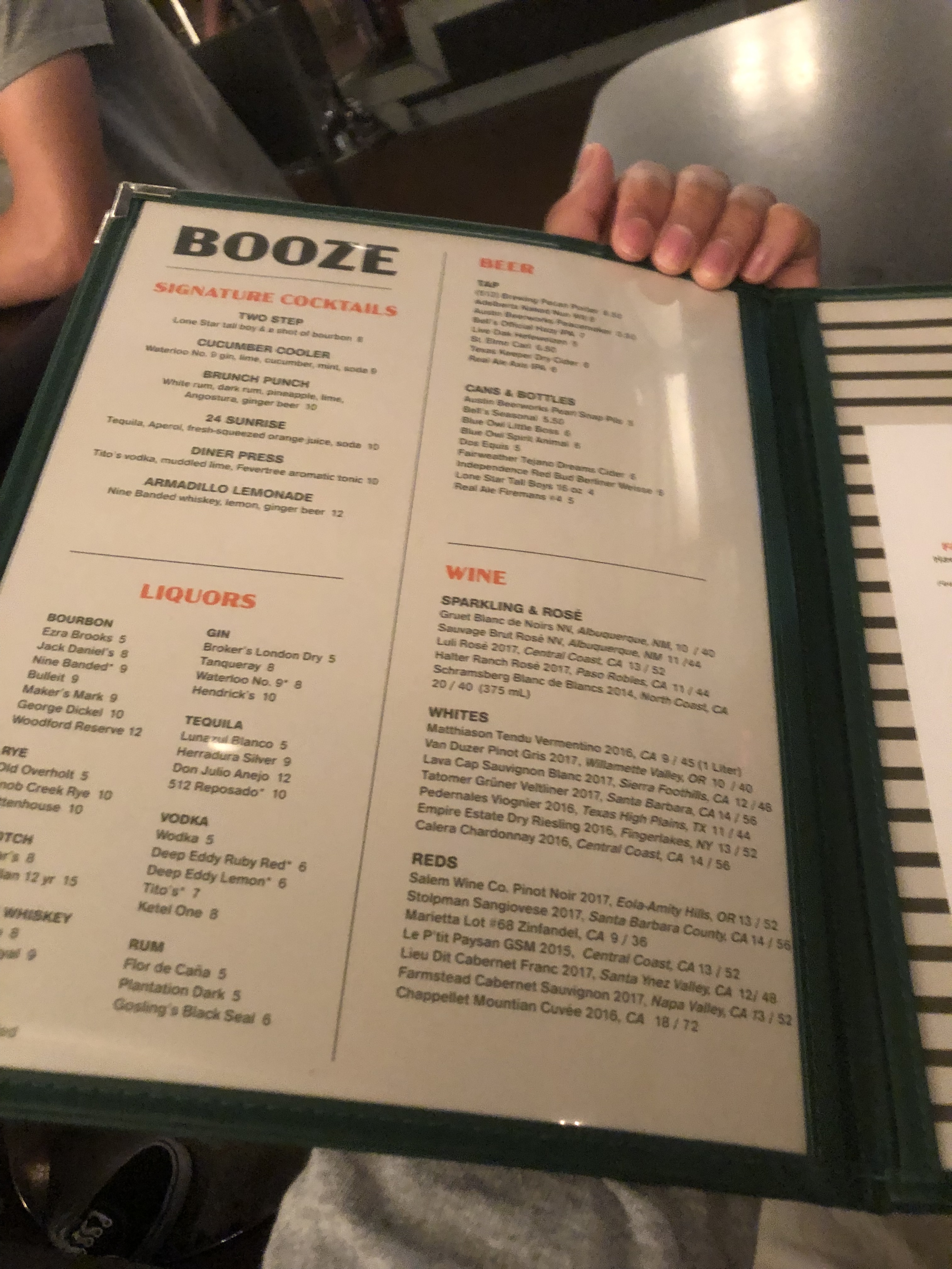 My first experience at 24 Diner on North Lamar was excellent. The atmosphere was screaming bring the squad, but sadly everyone was busy so I decided to go by myself. 24 Diner is open 24/7. The porch was open and inviting, the hosts look all friendly The bar looked open and ready to seat at least eight more people. The tables in the middle are bustling with college students of all sizes. The atmosphere was welcoming and warm I did not feel very cold at all which is a huge problem with quite a few restaurants.Sometimes I am very sensitive to really chilly restaurants. Farm to Table was very heavily implied. Farm to table means from the Farm/ranch, to the restaurant, to your plate. The drink selection took up half the menu and then some, though I almost forgot I was in a diner.